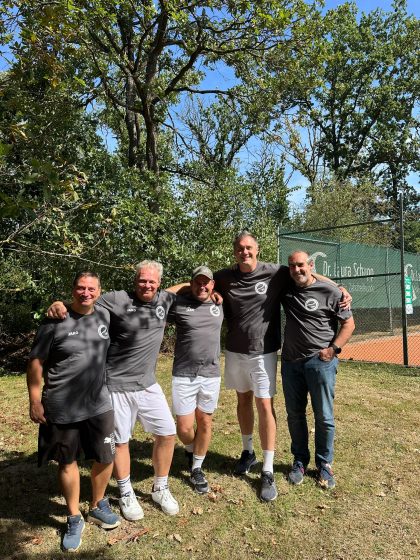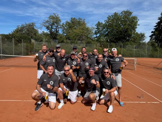 Unser Bild zeigt den Zusammenhalt zwischen Herren 40 I und Herren 40 II, die am letzten Spieltag zusammen auf unserer Anlage die erfolgreiche Saison feierten.